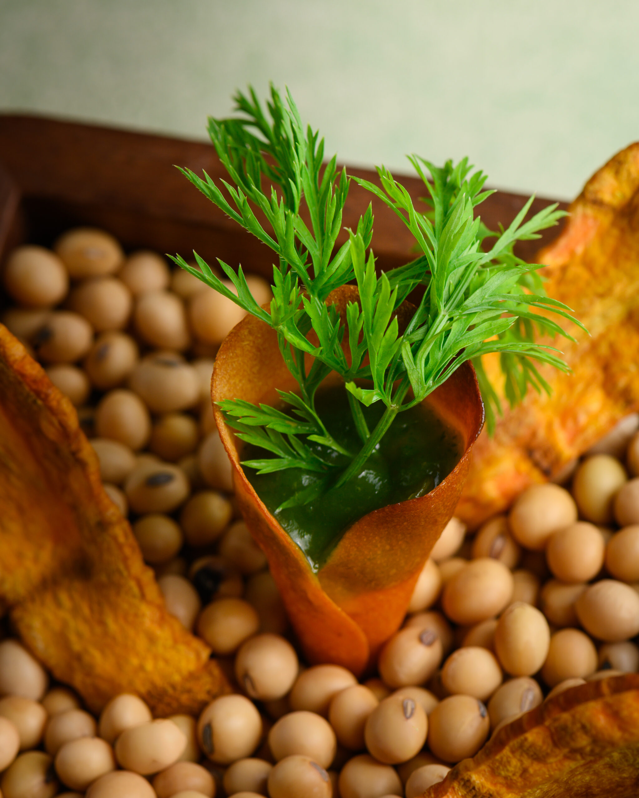The journey begins with Koji carrot. We take farm-fresh carrots and ferment them with Koji rice and concentrated carrot juice for 24 hours. This slow-cooking and fermentation process breaks down the starches, unlocking a natural sweetness and a savory depth that raw carrots simply cannot achieve. To finish, the carrots are charcoal-grilled, adding a subtle smoky veil that lingers on the palate. This “Koji-fication” transforms the vegetable into a bold, umami-rich foundation that serves as the heart of the cone.